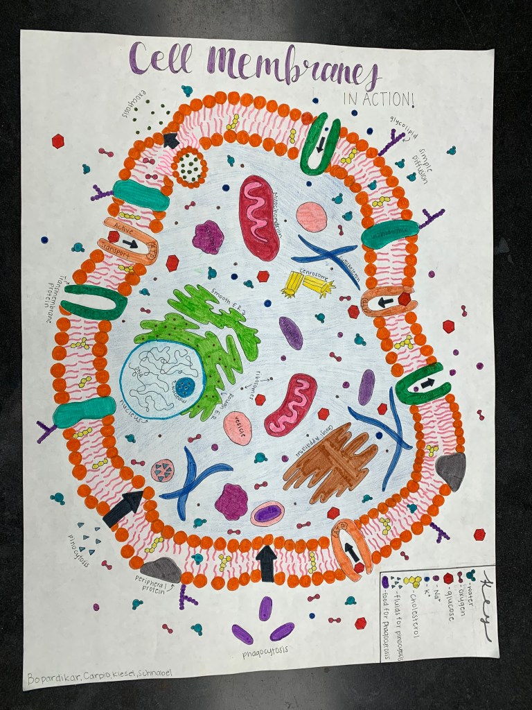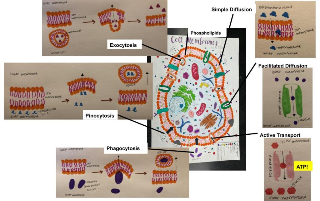 In class, we were split into groups and were able to make our own drawings of cell membranes! Each drawing of the cell shows how molecules are transported through the outer membrane into cell. Some examples of cell transport were exocytosis, phagocytosis, and pinocytosis. Below are some images of the cell that my group and I designed: